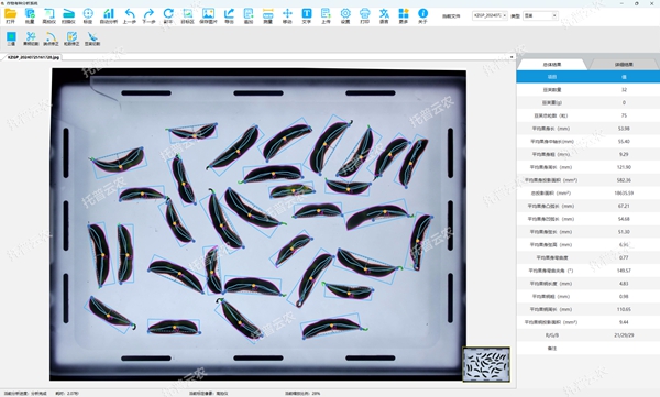 7.豆莢表型分析:可用于測定≥5種毛豆、蠶豆、豌豆等作物的果身、果柄等表型指標,支持單次測量≥50個毛豆豆莢,可自動分析豆莢數(shù)量、豆莢粒數(shù)、豆莢重、果身長、果身粗、果身周長、果身面積、果身凸弧長、果身凹弧長、果身弦長、果身弦高、果身彎曲度、果身彎曲夾角、果柄長、果柄粗、果柄周長、果柄投影面積等參數(shù);支持對豆莢測量端點、果柄、豆莢粒數(shù)等進行修正,適用于掃描儀或高拍儀獲取的圖片。