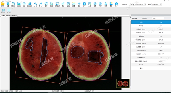 8.瓜果表型分析:用于測量西瓜切面的瓜瓤、瓜皮等果形指標,可自動分析切面橫徑、切面縱徑、果形指數(shù)、切面周長、切面面積、瓜皮厚度、瓜皮面積、瓜瓤面積、瓜瓤空洞面積、顏色以及瓜重等果形參數(shù),軟件支持圓形水果表型測定,也可支持定制其它園藝作物果實切面表型指標。常用于西瓜果實育種、西瓜關(guān)鍵基因定位、逆境脅迫、西瓜表型指標測定等領(lǐng)域。