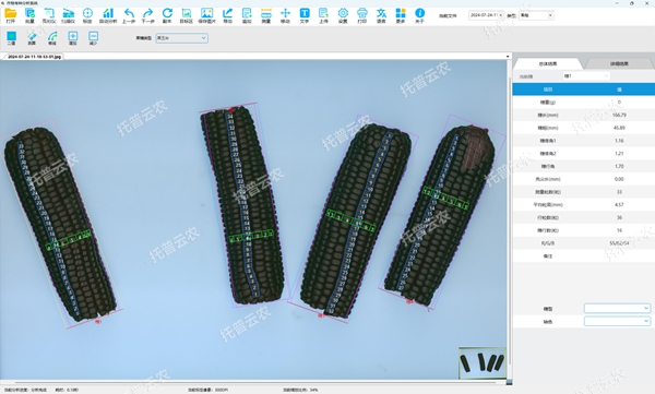 3.玉米整穗分析:可自動計算出玉米果穗的穗長、穗粗、禿尖長、左右穗緣角、穗行角、平均行粒數(shù)、粒厚、截面穗行數(shù)、穗粗、軸粗,顏色以及其平均值。