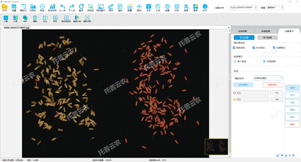 2.水稻結(jié)實率分析:能精準顯示種粒外接矩形,得出空粒數(shù),實粒數(shù),結(jié)實率百分比數(shù)據(jù),并可直接標記空粒、實粒,顯示各籽粒粒型數(shù)據(jù)(長、寬、長寬比、面積、周長),可預設(shè)水稻粳粒結(jié)實率模型和水稻秈粒結(jié)實率模型,并支持根據(jù)自己的品種重新學習建模。